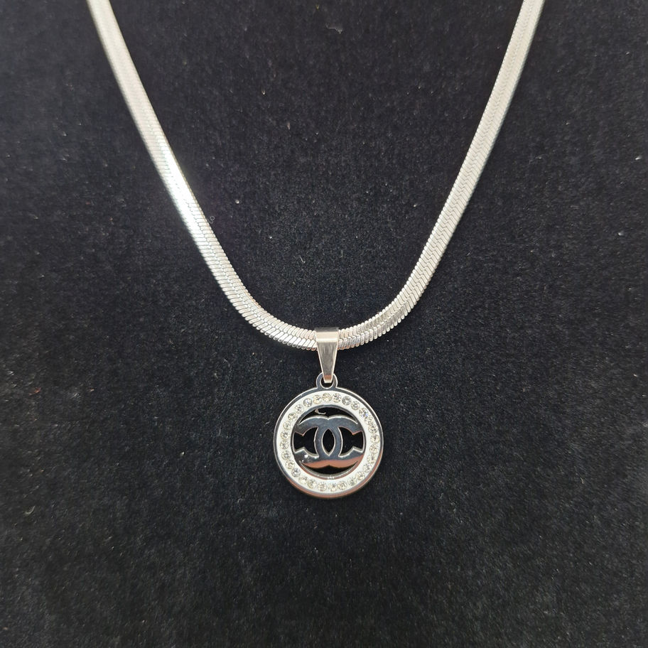 Colar em aço inox com pendente estilo Chanel adornado com strass. Peça sofisticada e brilhante, perfeita para ocasiões especiais. Os cristais de strass conferem um toque de elegância e glamour. Material resistente à corrosão e hipoalergênico, garantindo conforto e durabilidade.