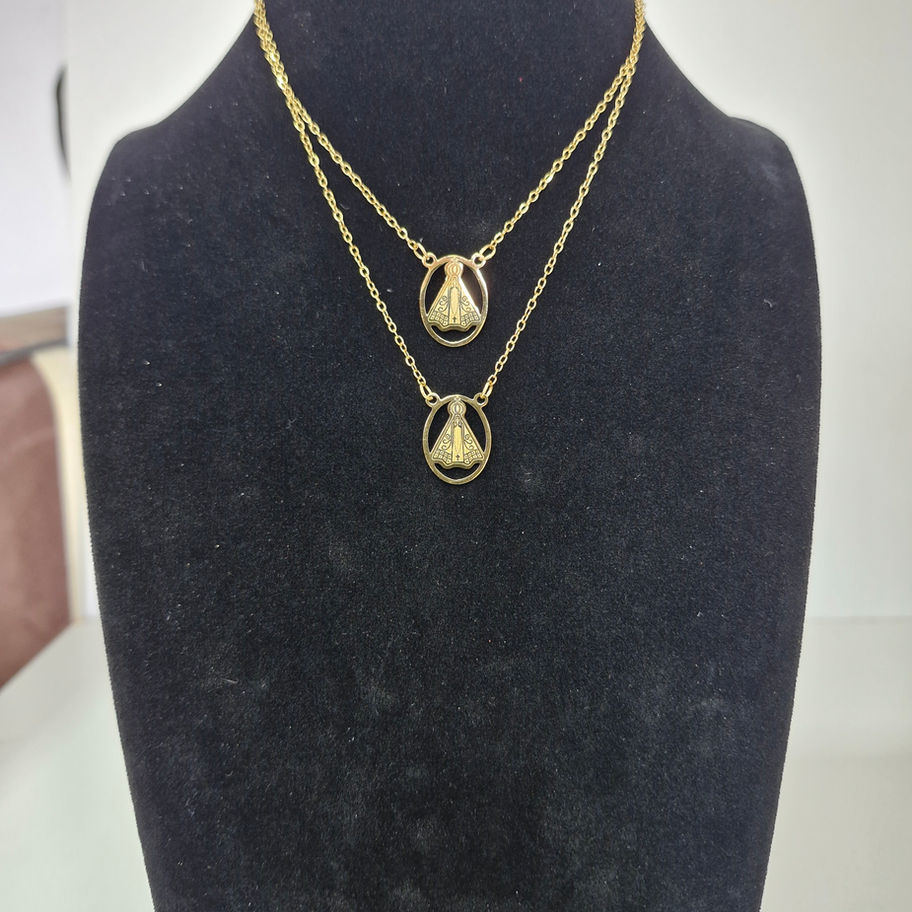 Escapulário em aço inox com pendentes Nossa Senhora. Peça religiosa elegante e significativa, confeccionada com material de alta qualidade. Resistente e hipoalergênico, ideal para uso diário. Perfeito para quem busca um acessório com proteção espiritual e devoção.